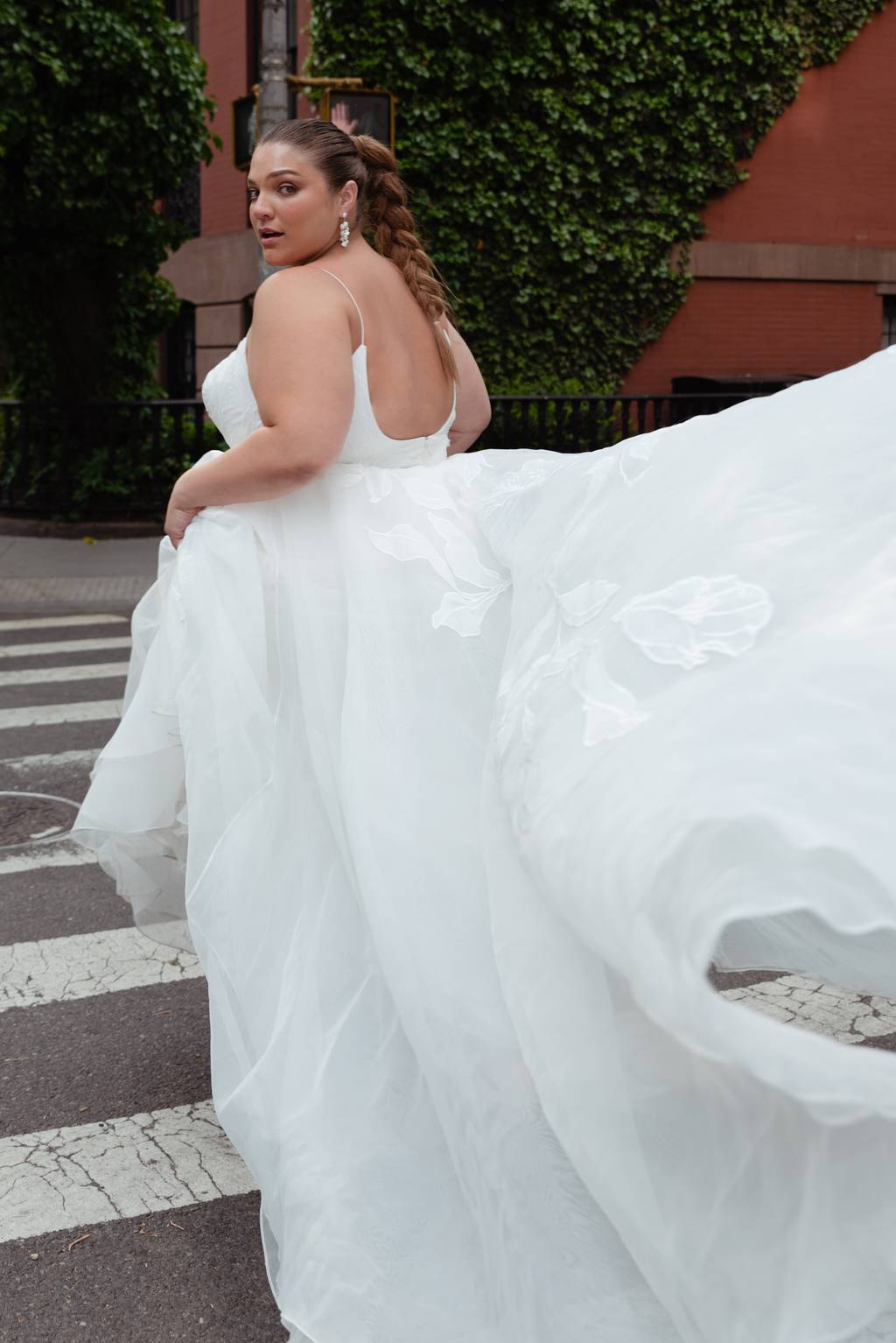 The Abernathy scoop neck organza bridal gown is effortlessly romantic. Oversized floral organza applique trails from the fitted bodice down onto the dramatic yet airy ball skirt.