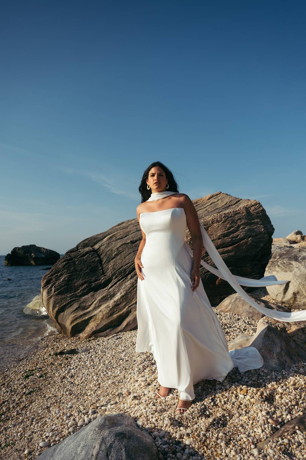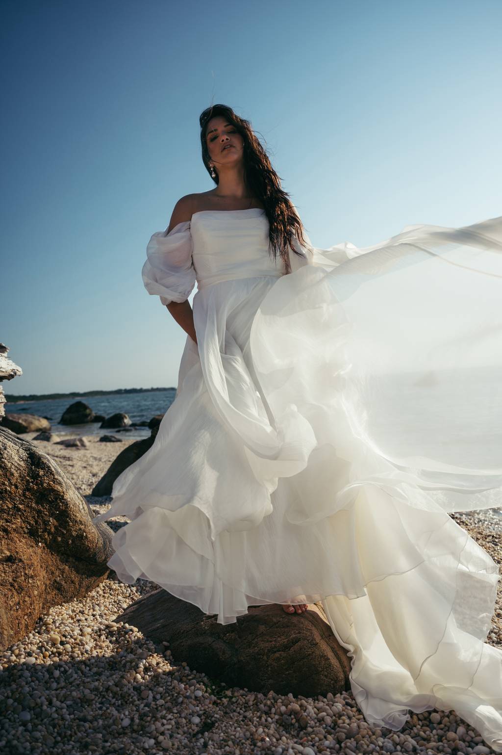 The Noa gown, cut in our beautifully shimmery iridescent chiffon, is a perfect blend of whimsy and classicism. The clean lines of the straight neckline are balanced by dramatic sleeves that fall elegantly off the shoulders. A detachable Watteau cape adds another layer of romance.