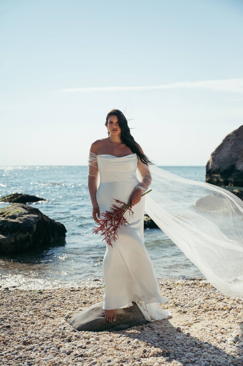Modern details elevate and update the otherwise timeless silhouette of the Olivia gown. Cut in our elegantly fluid luxe satin fabric, the draped cowl bodice lead way to a sheer off the shoulder sleeve. Curved princess seams sculpt the fit and flare skirt, and detachable tulle streamers lend a hint of whimsy.