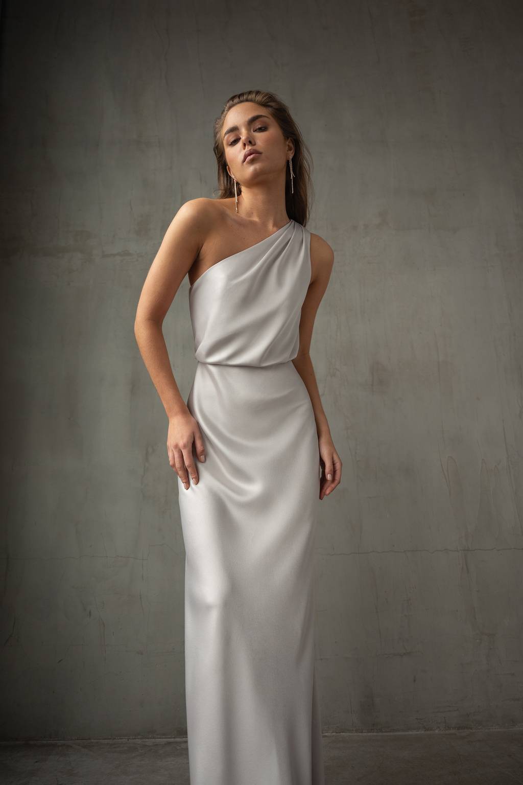 The Sterling dress, cut in our lustrous luxe satin fabric, takes inspiration from old Hollywood. Featuring an elegant one shoulder neckline with a pleated detail and a flattering blouson waist, her slinky bias cut skirt flatters your every curve. Shop Sterling online.