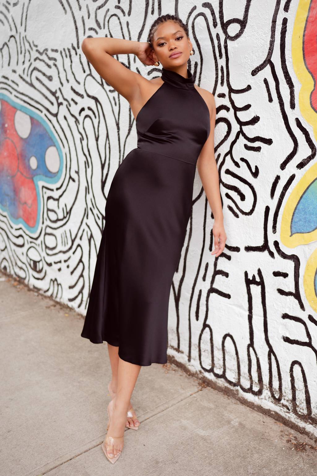 The Nicolette dress makes a sultry statement for any event. Cut in our lustrous luxe satin, she features an effortlessly draped halter neckline, an open back, and a chic midi length skirt.