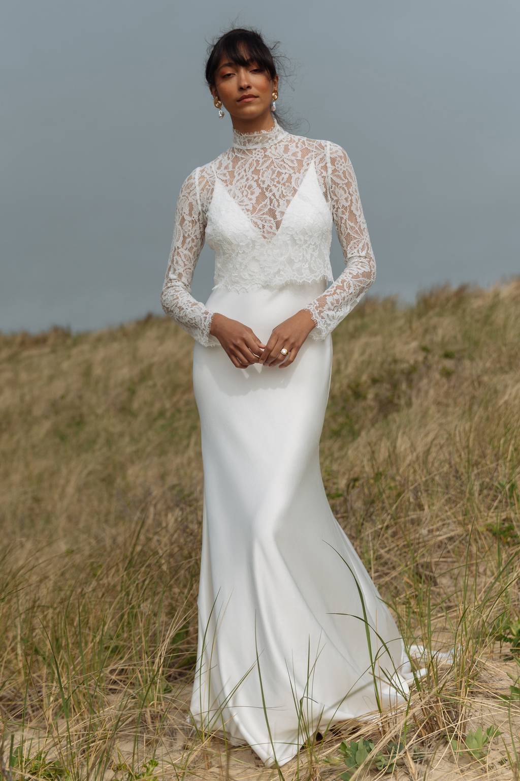 The Bettina lace topper offers a modern yet timeless way to complement your gown. Cut in our soft and delicate Marcelle lace, the fabric is cut close to the body, and moves with you. The scalloped mock neck adds a bit of vintage romance, and covered buttons up the back give you a classic and beautifully finished look. View now.