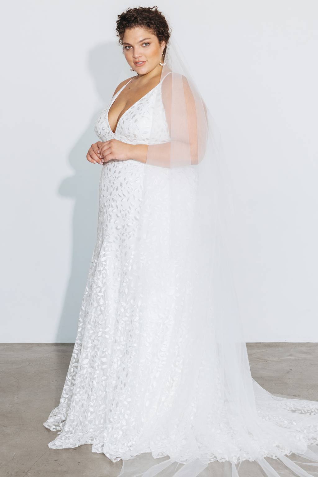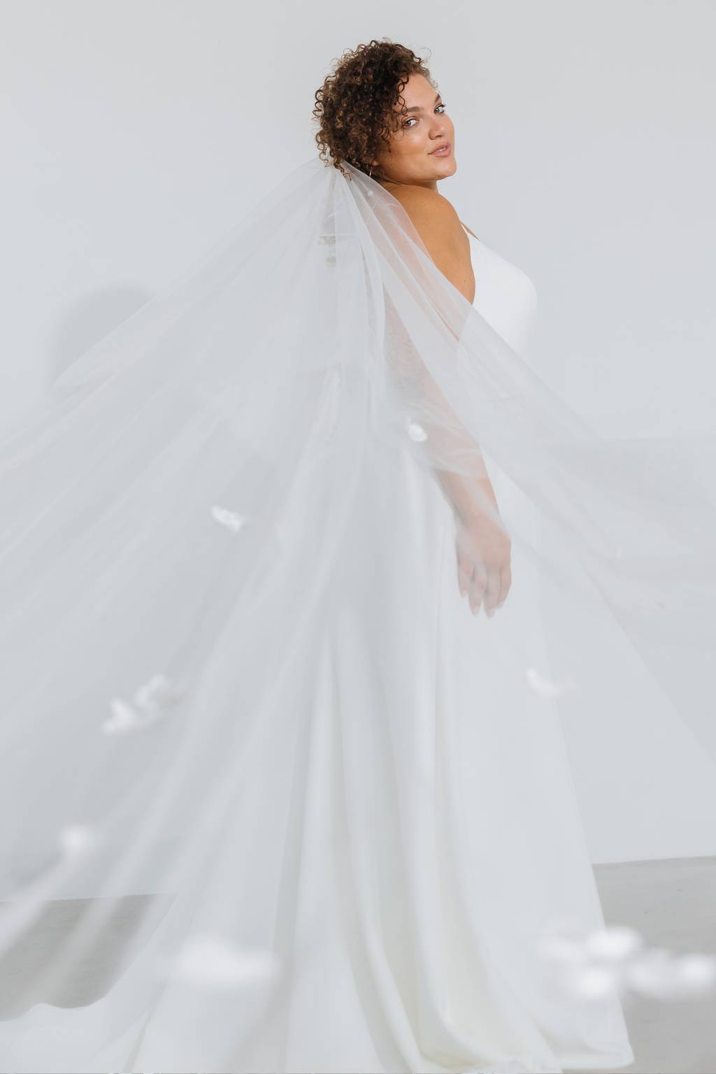 Soft and fine layered tulle cascades into a timeless cathedral length train. Shop Constance now.