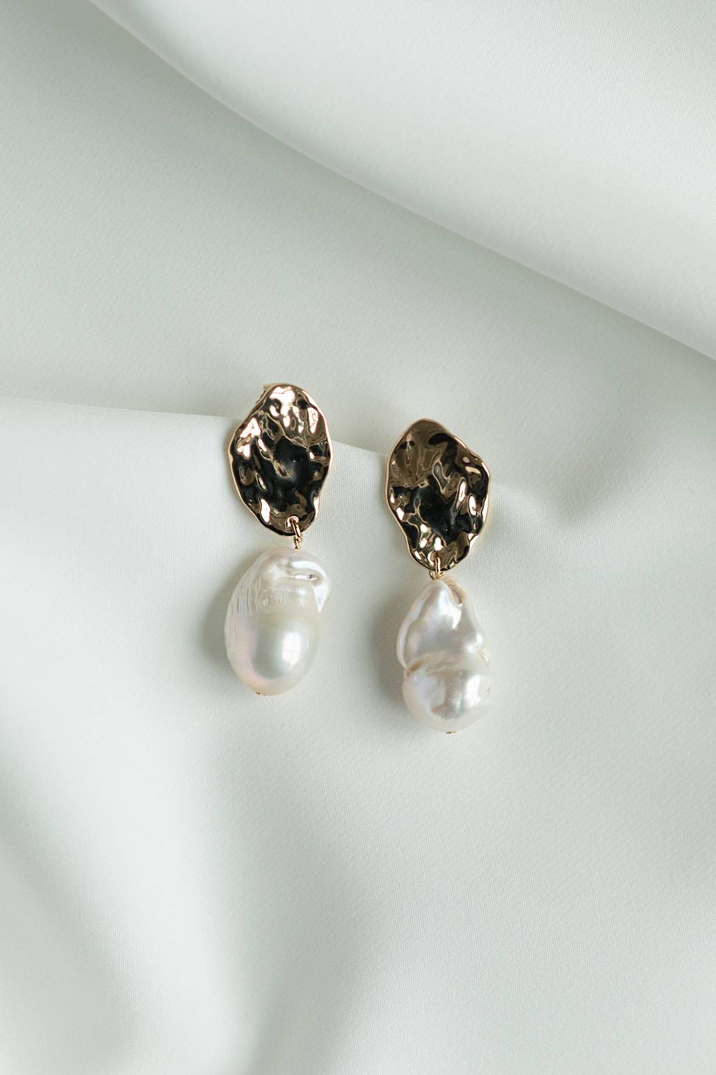 A large freshwater pearl hangs from an organic hammered gold disc for a modern statement earring that adds an easy cool factor to any gown. Shop now!