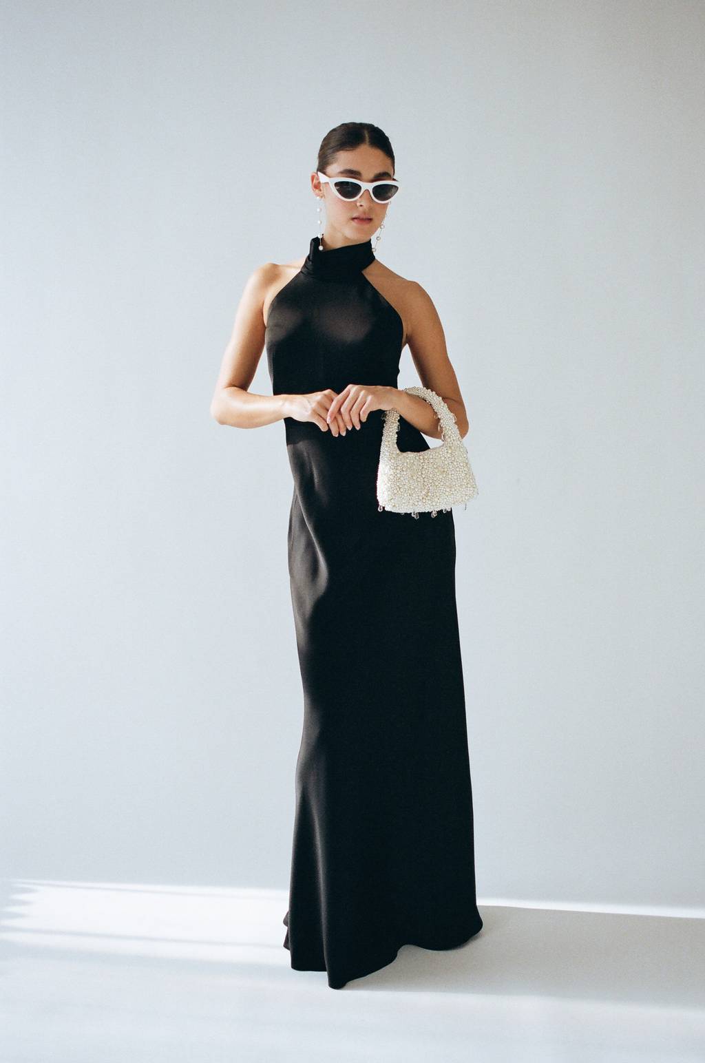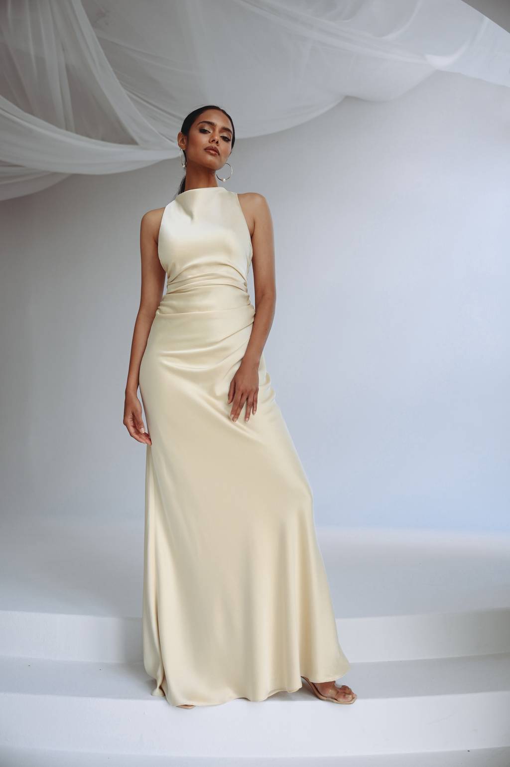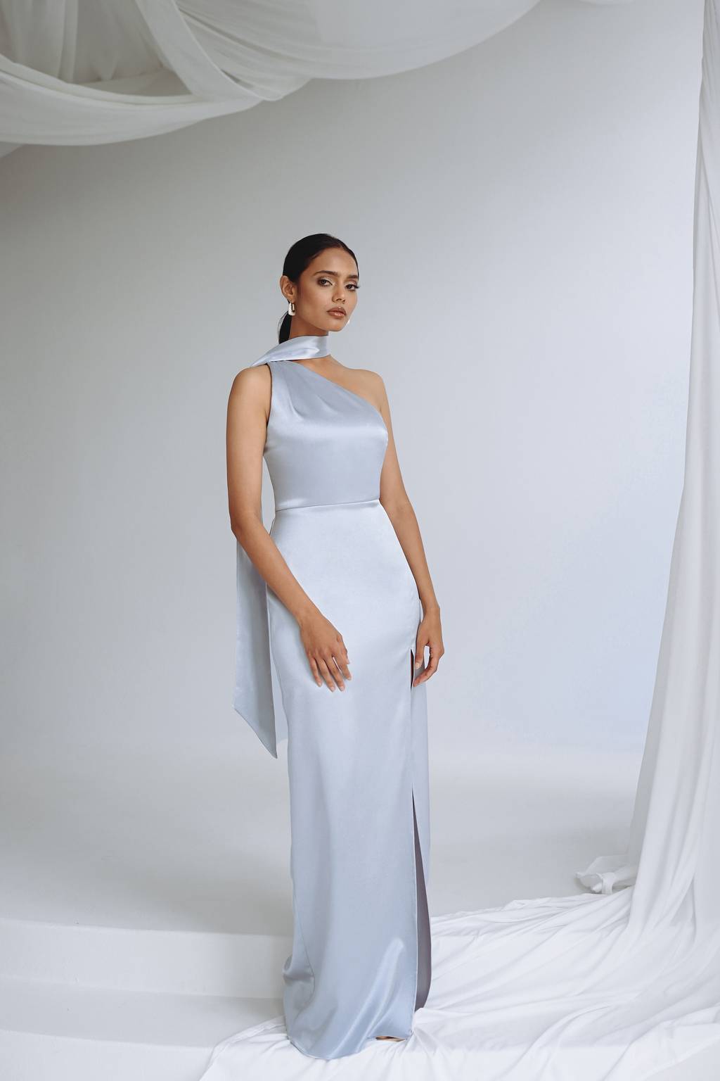 The Hepburn dress is a modern nod to old Hollywood glam. Cut in our beautifully lustrous satin back crepe fabric, her elegant asymmetrical halter neckline wraps around with a dramatic scarf detail.