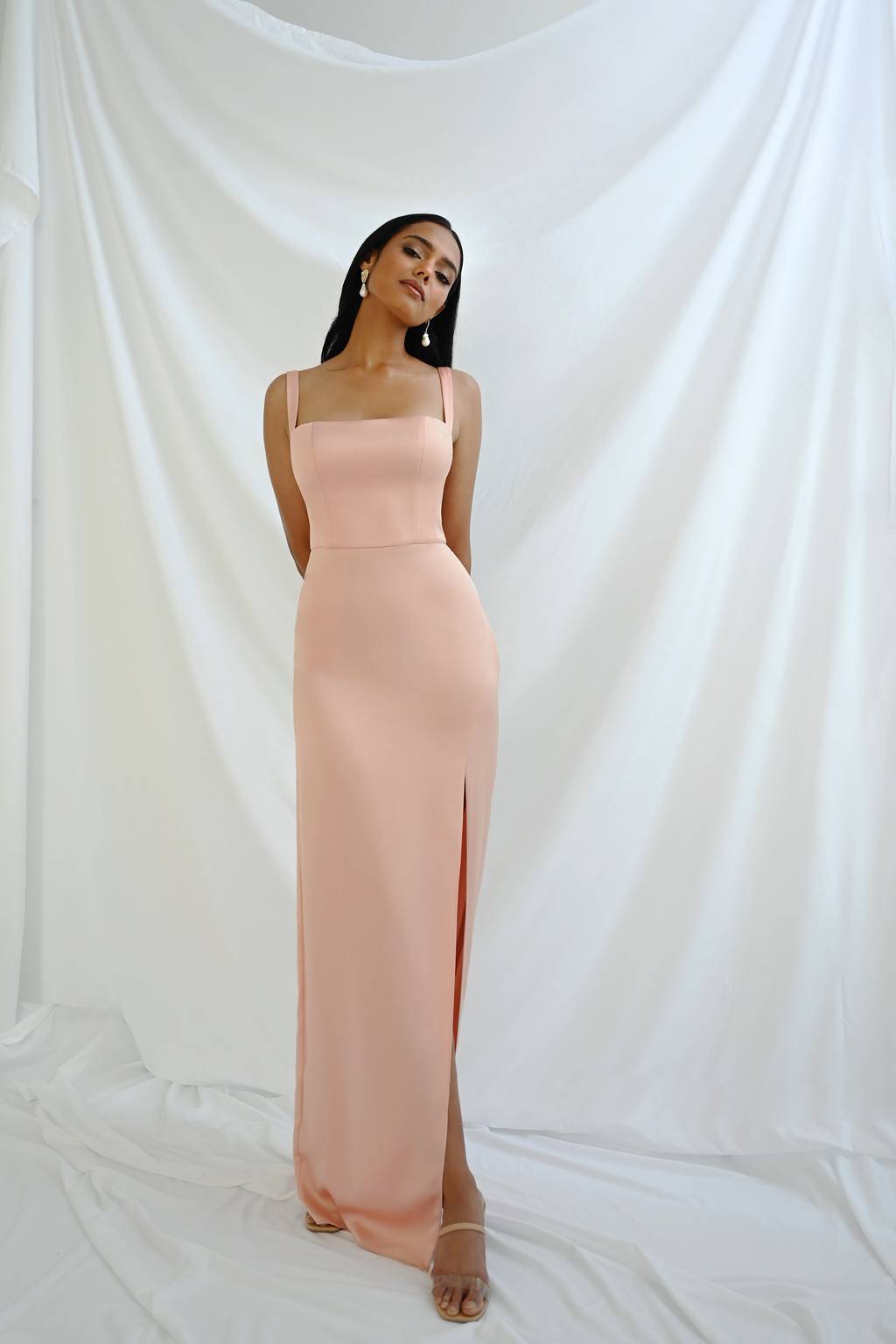 The Wren satin bridesmaid dress would be just as appropriate walking down a red carpet as she would be walking down the aisle. With her sleek 90’s styling and flattering details she’s sure to make you the best dressed at the wedding.