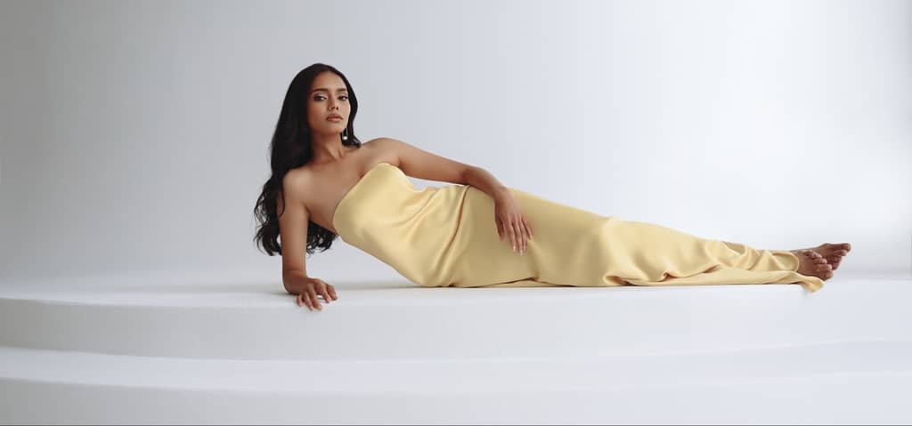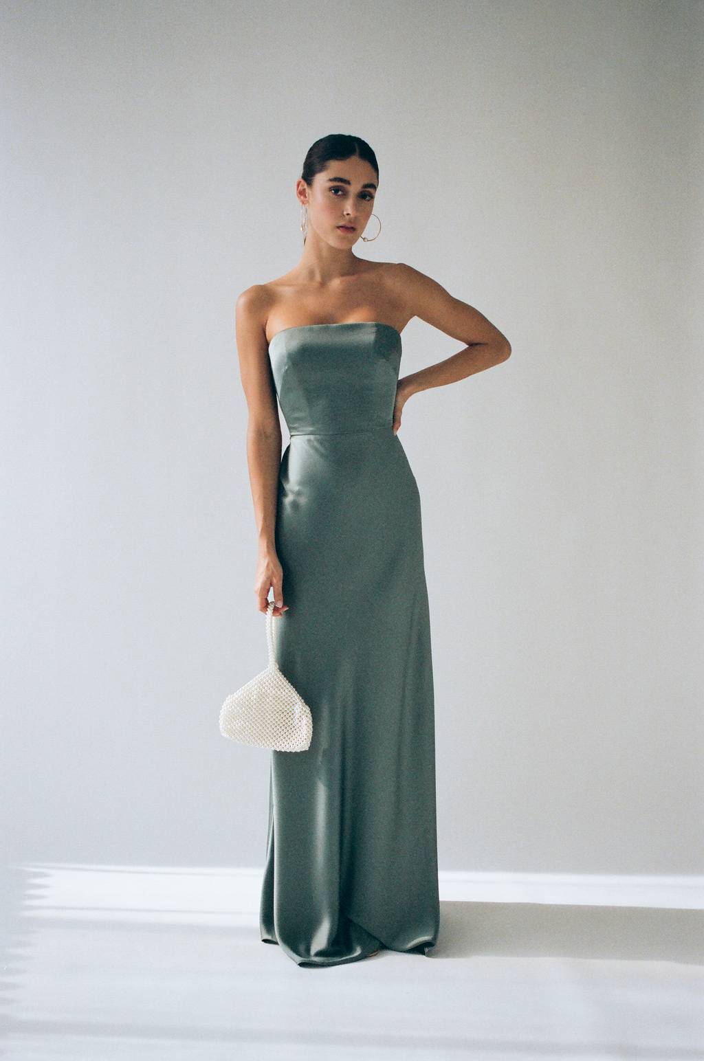 The Melody satin dress is as chic as can be. Featuring a sleek strapless neckline and a slinky bias cut skirt, she’s a timeless beauty.