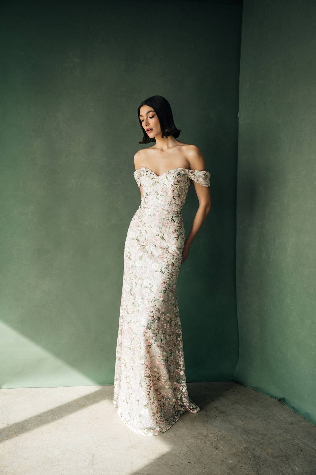 The Reina dress is cut in our new Ophelia embroidery which features intricately textured blooms and delicate leaves. This style features a classic sweetheart neckline, detachable swag sleeves, and a flattering fit and flare skirt.