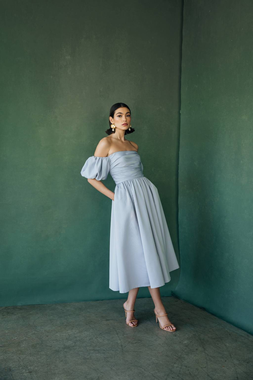 The Regina dress is a chic and versatile option for any stylish event. She features a sleek, straight strapless neckline, detachable puff sleeves, a flirty midi length dirndl skirt, and everyone’s favorite, POCKETS!