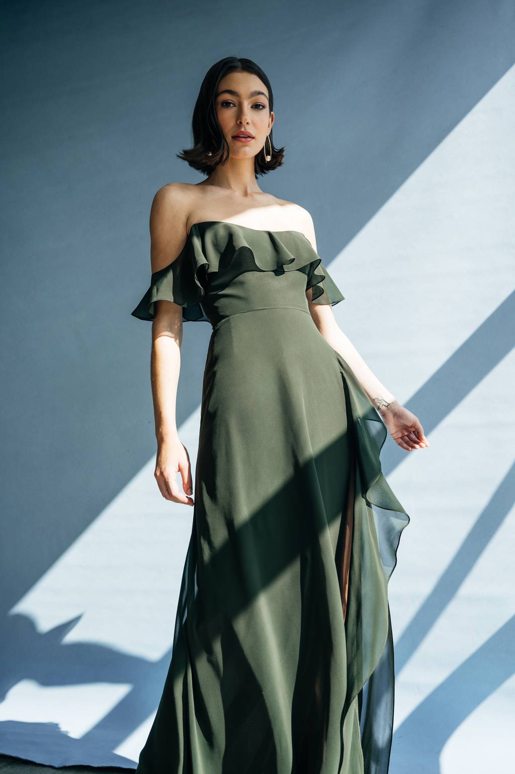 The Salma chiffon dress is classically romantic. Featuring an effortlessly flattering off the shoulder neckline with a dainty ruffled sleeve, and a daring side slit with a delicately cascading ruffle adding another layer of femininity.