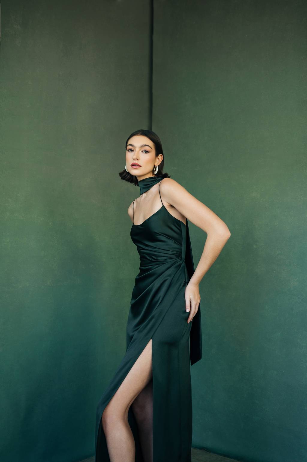 The Wren satin bridesmaid dress would be just as appropriate walking down a red carpet as she would be walking down the aisle. With her sleek 90’s styling and flattering details she’s sure to make you the best dressed at the wedding.