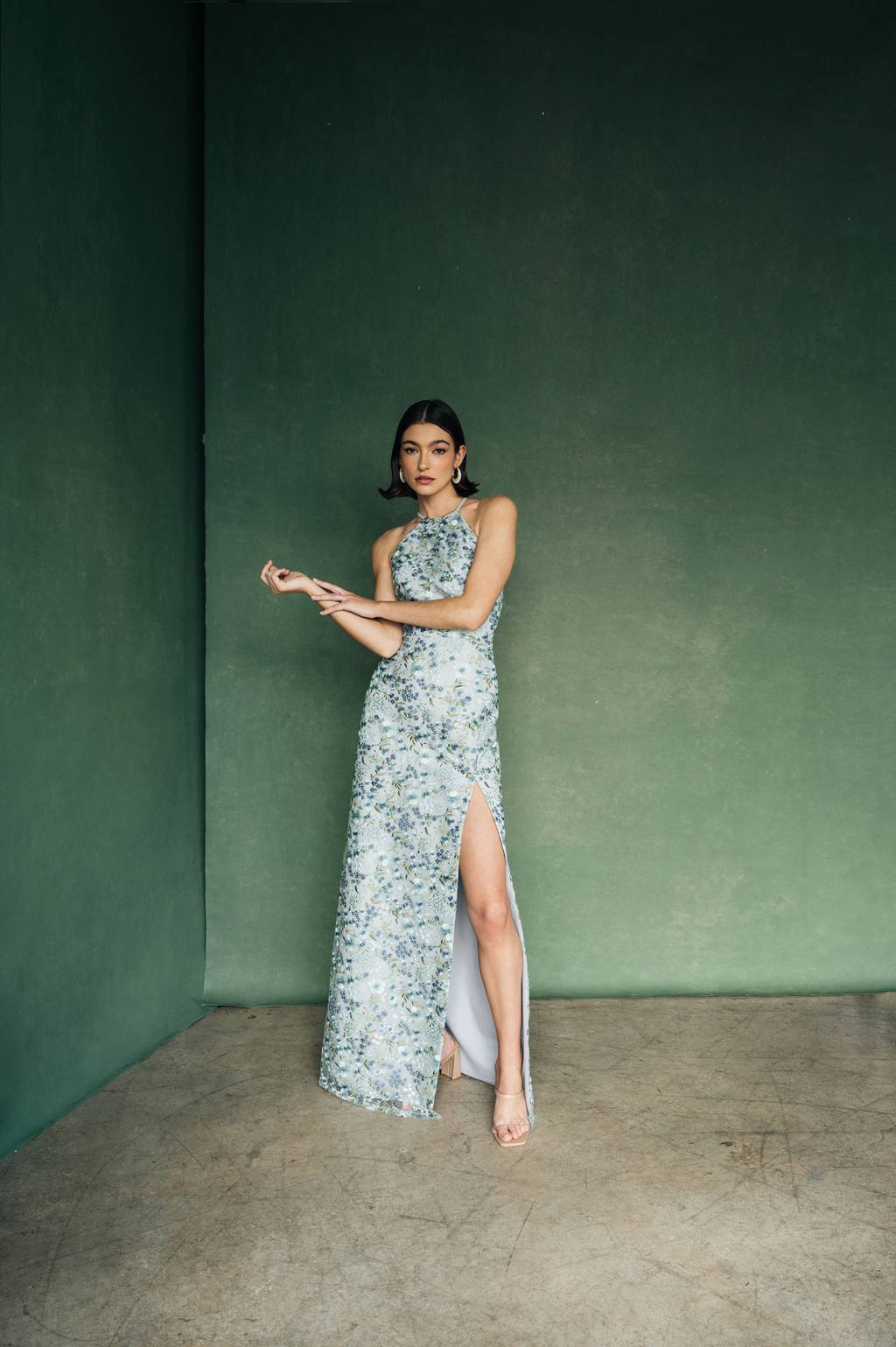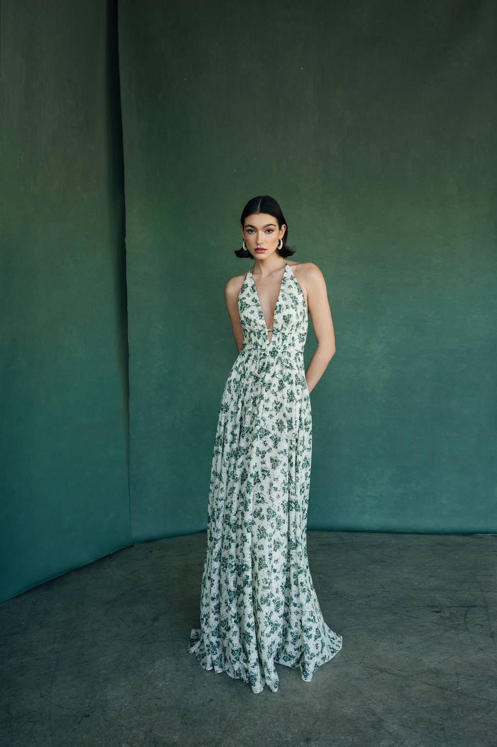 The Rebecca dress is cut in our new Ophelia embroidery which features intricately textured blooms and delicate leaves. This style features a sleek halter neckline and a flattering column skirt with a daring slit and strappy open back.