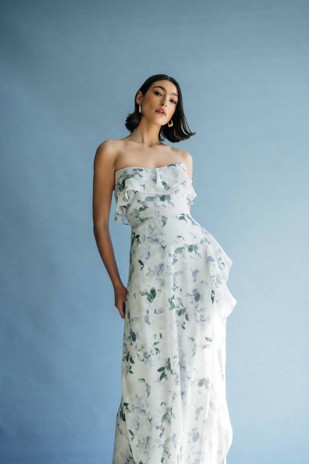 The Simona printed chiffon bridesmaid dress is brimming with feminine details. The strapless cowl neckline effortlessly flatters your décolletage and balances the hopelessly romantic ruffled skirt, the neck scarf lends a dramatic detail.