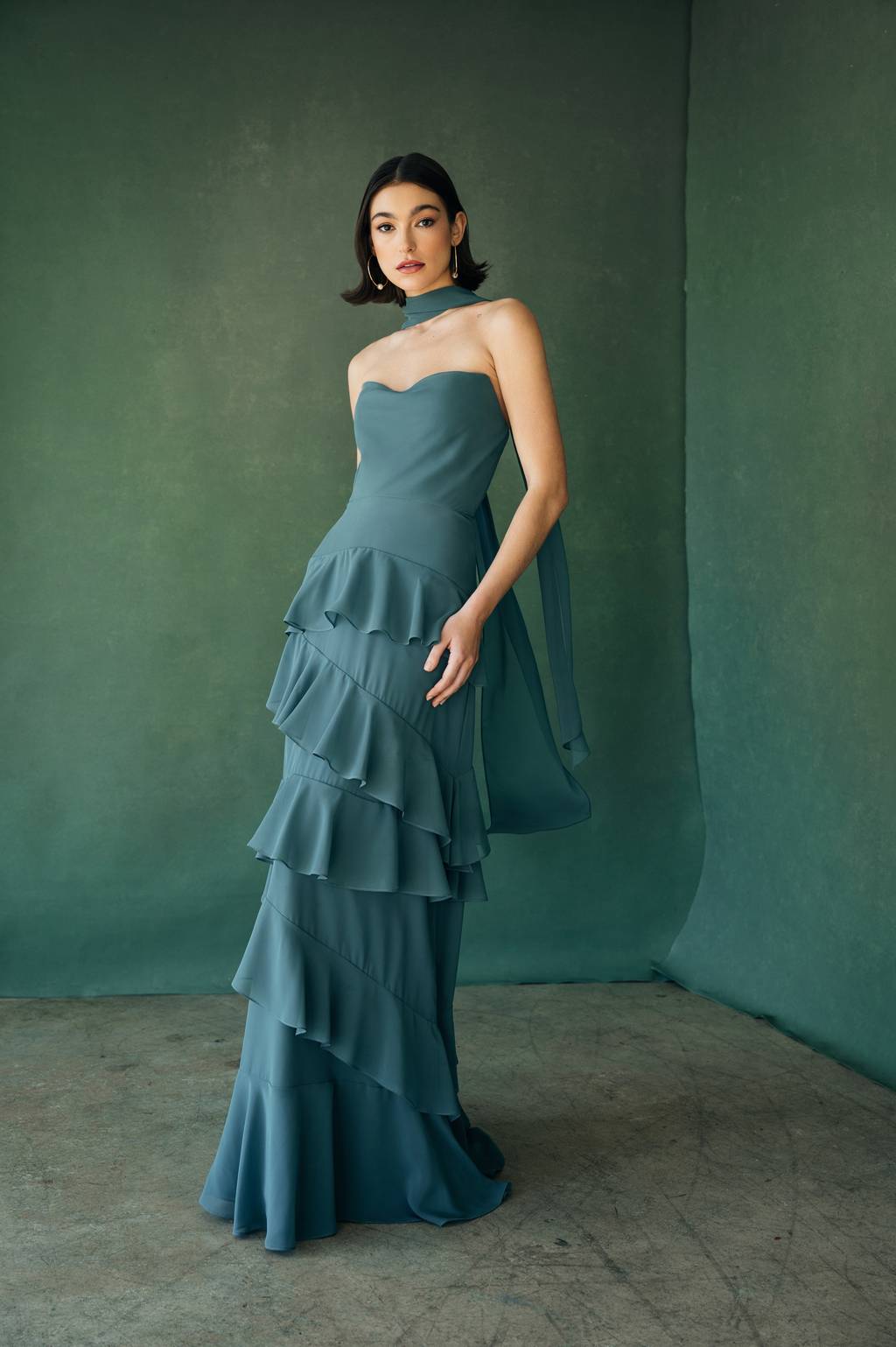 The Simona chiffon bridesmaid dress is brimming with feminine details. The strapless cowl neckline effortlessly flatters your décolletage and balances the hopelessly romantic ruffled skirt, the neck scarf lends a dramatic detail.