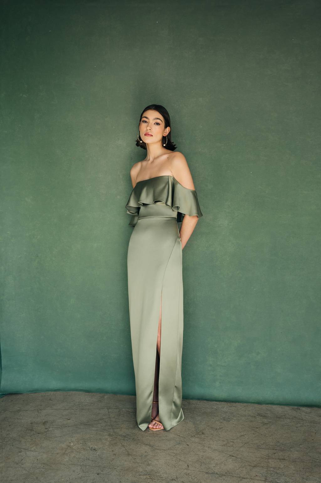 The Winter satin dress has a sleek strapless neckline and an elongating column skirt with a playful yet elegant ruffle to keep this style flirtatious.