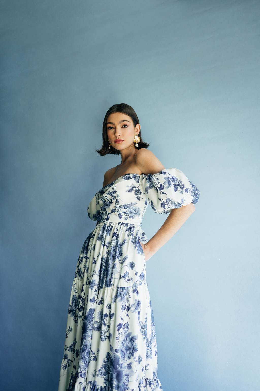 The Sutton dress is a garden party unto herself! Her chic straight neckline gives way to playful and versatile detachable puff sleeves, and her tiered skirt is nothing if not romantic!