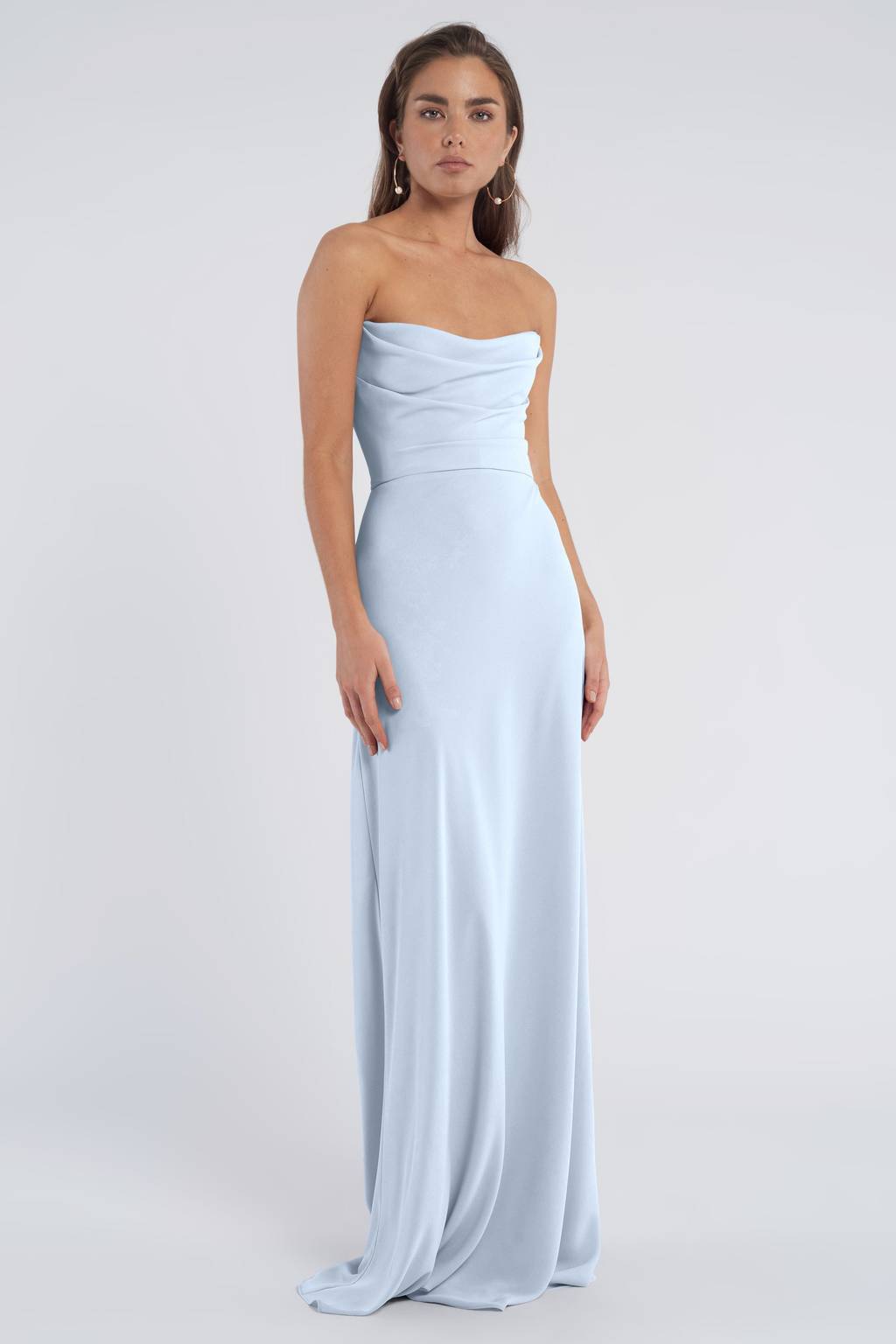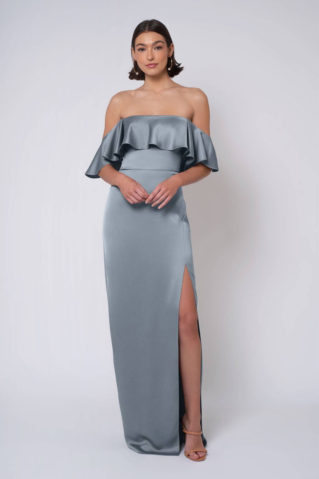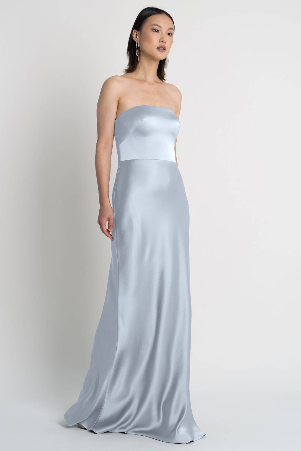 The Winter satin dress has a sleek strapless neckline and an elongating column skirt with a playful yet elegant ruffle to keep this style flirtatious.