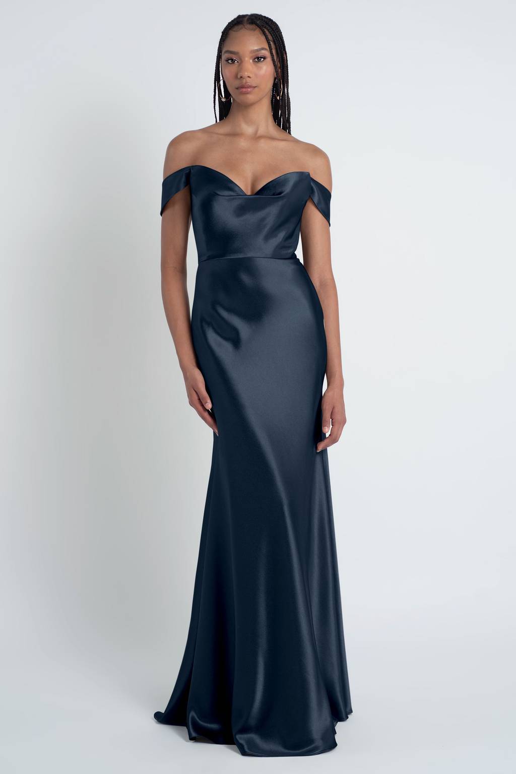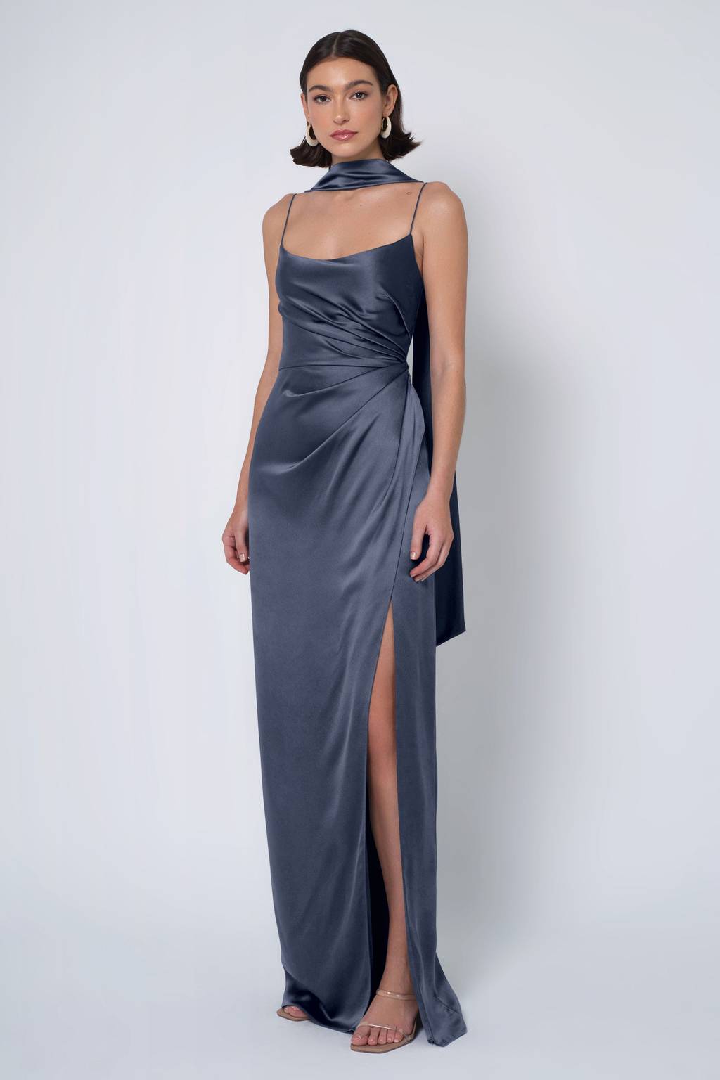 The Wren satin bridesmaid dress would be just as appropriate walking down a red carpet as she would be walking down the aisle. With her sleek 90’s styling and flattering details she’s sure to make you the best dressed at the wedding.