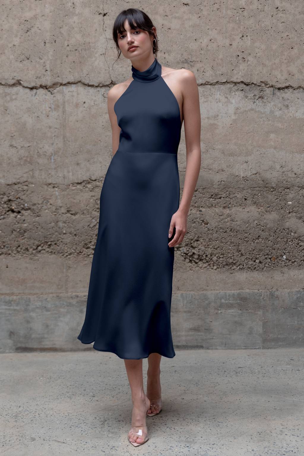 The Nicolette dress makes a sultry statement for any event. Cut in our lustrous luxe satin, she features an effortlessly draped halter neckline, an open back, and a chic midi length skirt.