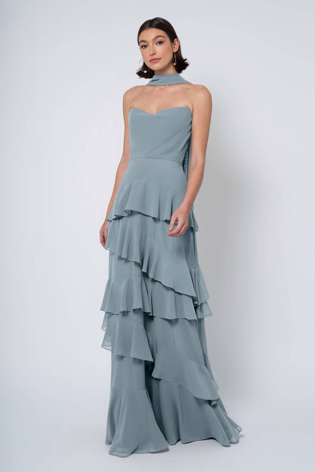 The Simona chiffon bridesmaid dress is brimming with feminine details. The strapless cowl neckline effortlessly flatters your décolletage and balances the hopelessly romantic ruffled skirt, the neck scarf lends a dramatic detail.