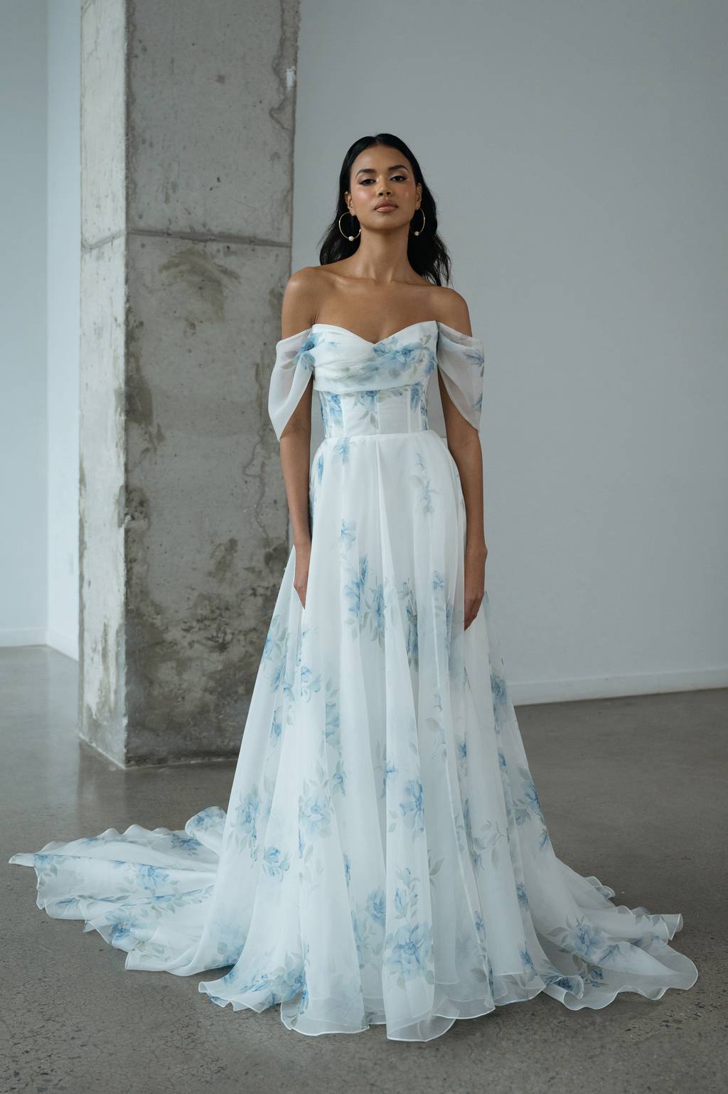 The Hazel gown is cut in our new printed silk organza fabric which features beautifully hand painted watercolor roses in blue! The dramatically draped sweetheart neckline is flanked by pleated off the shoulder sleeves. The full circle cut ball skirt brings a sweeping drama to the silhouette.