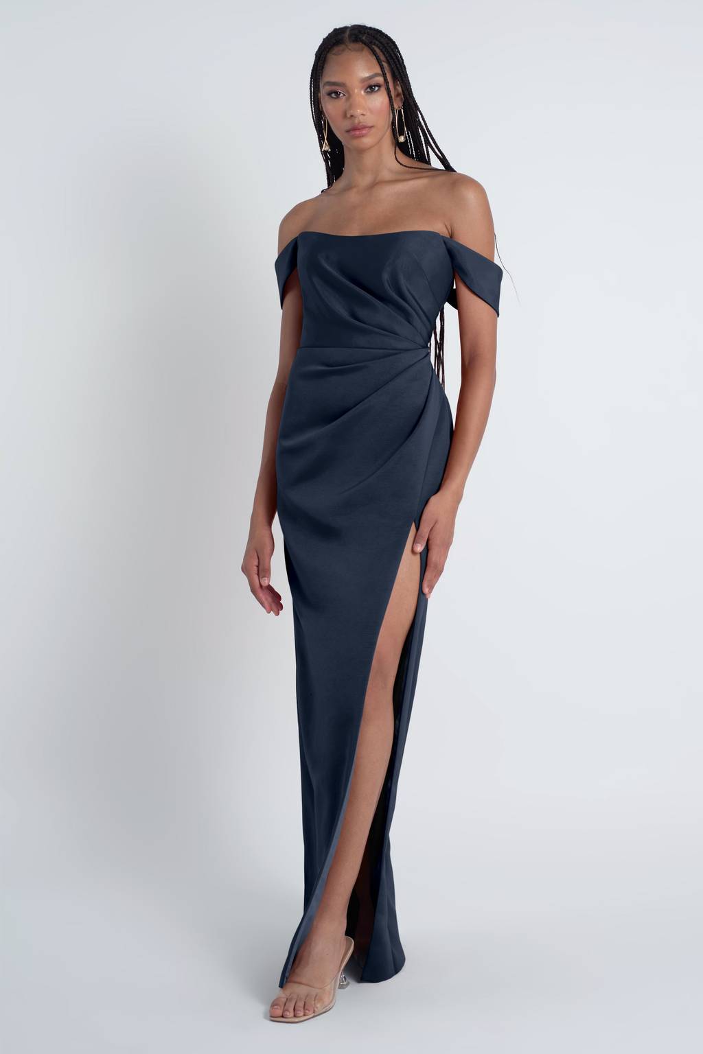 The Sawyer dress, cut in our luminous luxe satin fabric features elegantly draped off the shoulder sleeves and a soft cowl neckline. Her bodice is fully boned with bust cups for support and an effortlessly flattering fit. Her slim skirt features a cutaway slit for an alluring peek of skin.
