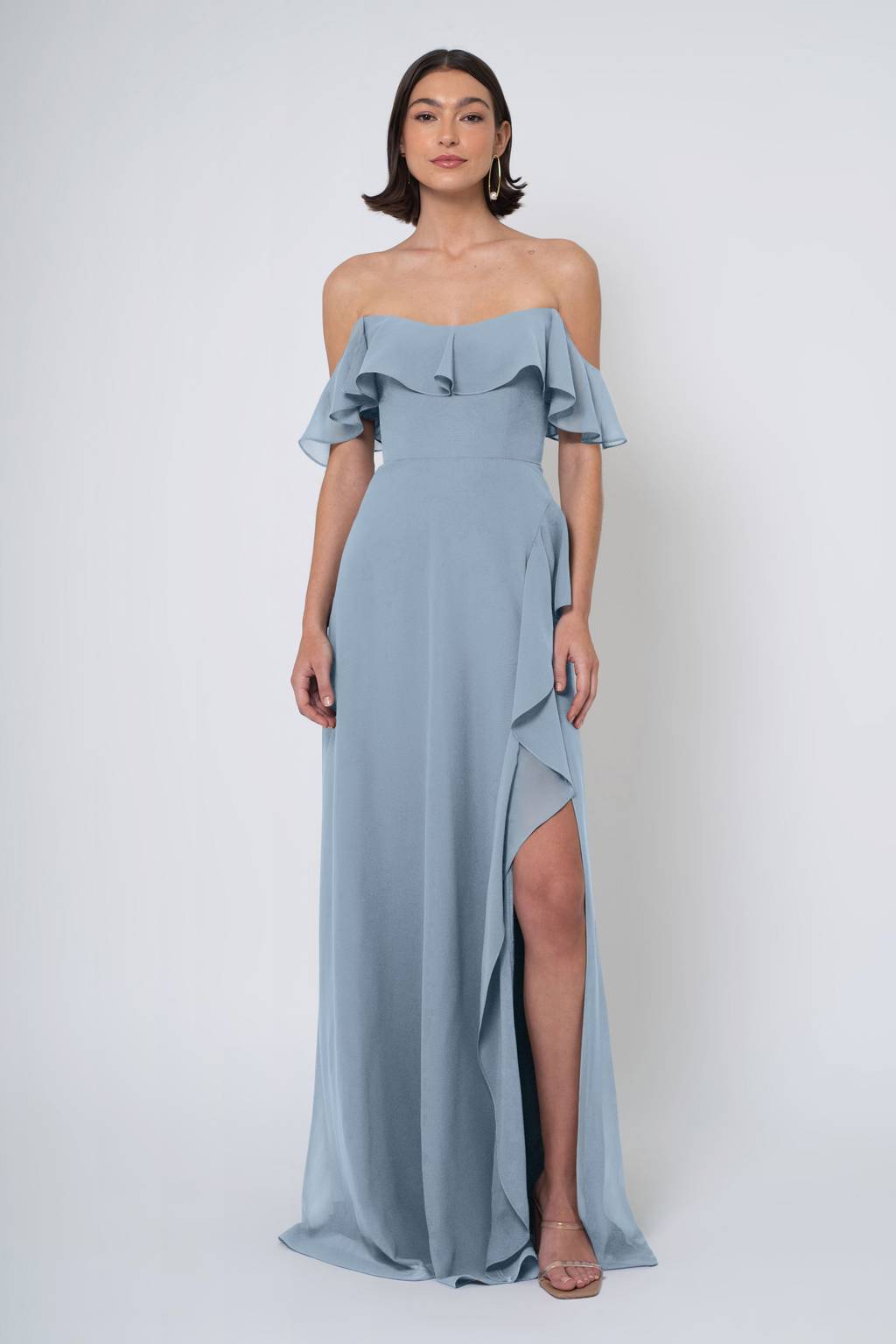 The Salma chiffon dress is classically romantic. Featuring an effortlessly flattering off the shoulder neckline with a dainty ruffled sleeve, and a daring side slit with a delicately cascading ruffle adding another layer of femininity.