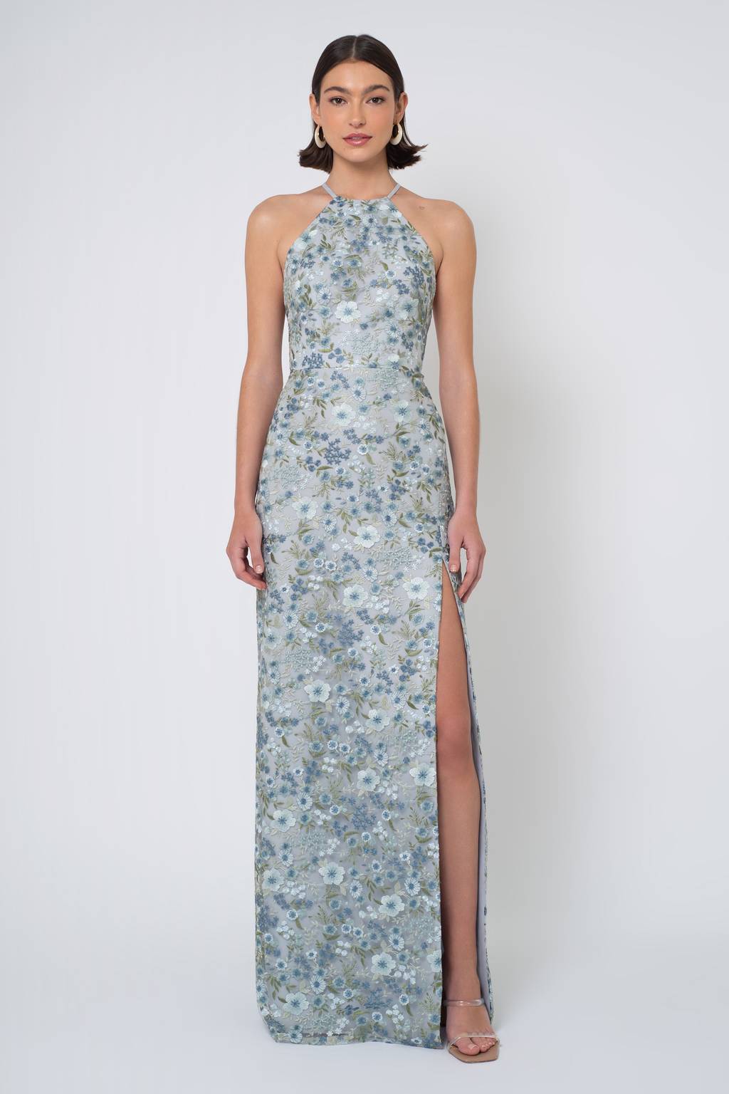 The Rebecca dress is cut in our new Ophelia embroidery which features intricately textured blooms and delicate leaves. This style features a sleek halter neckline and a flattering column skirt with a daring slit and strappy open back.