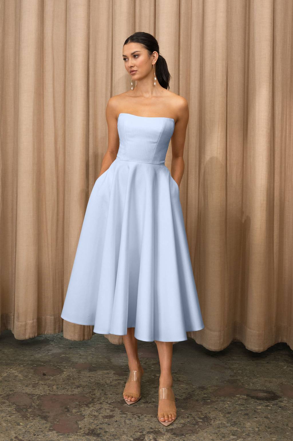 The Carrie dress is a chic and timeless option for all of your bridal events. Featuring an endlessly flattering corseted strapless bodice, and a full circle skirt made for twirling.
