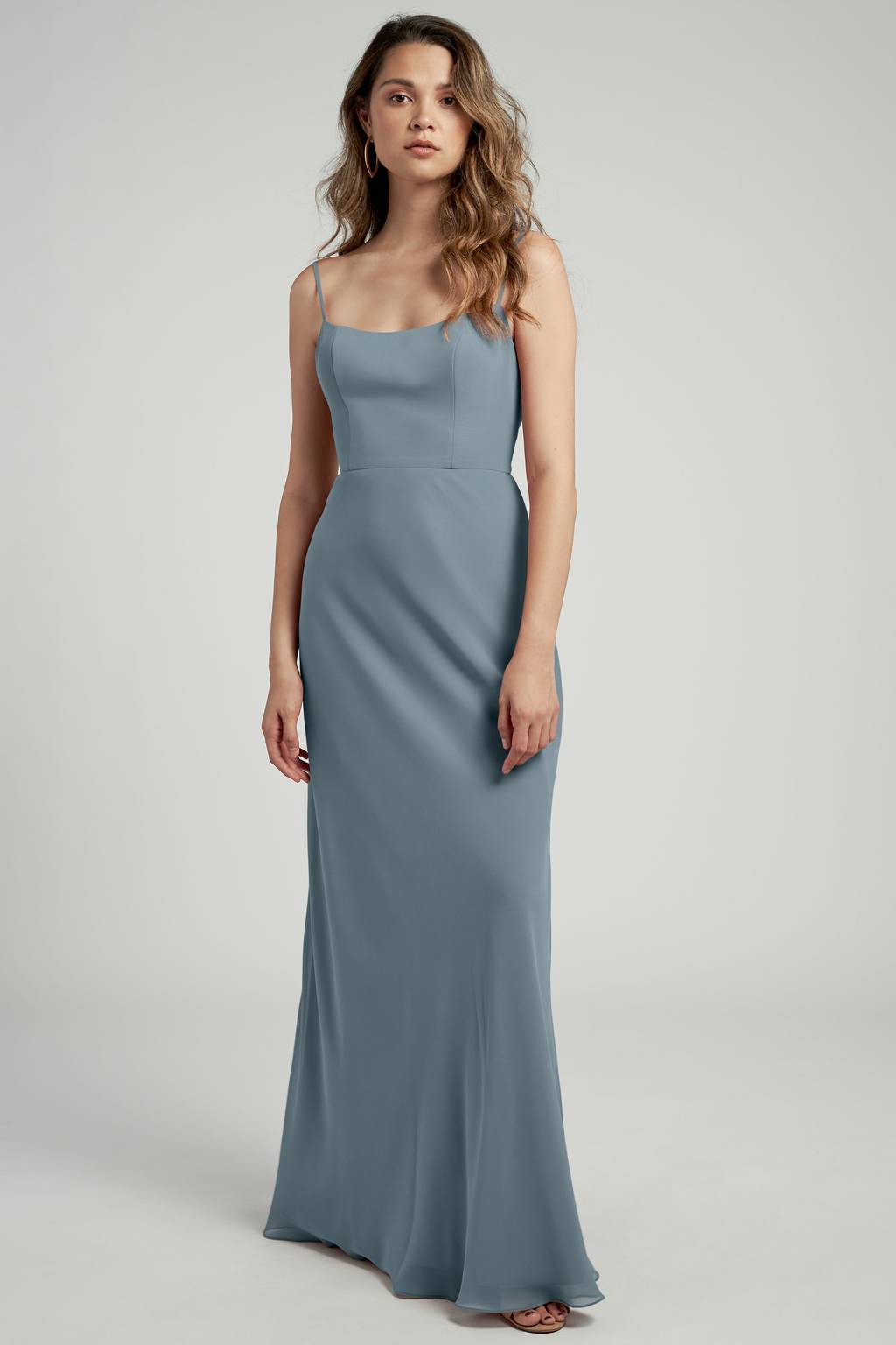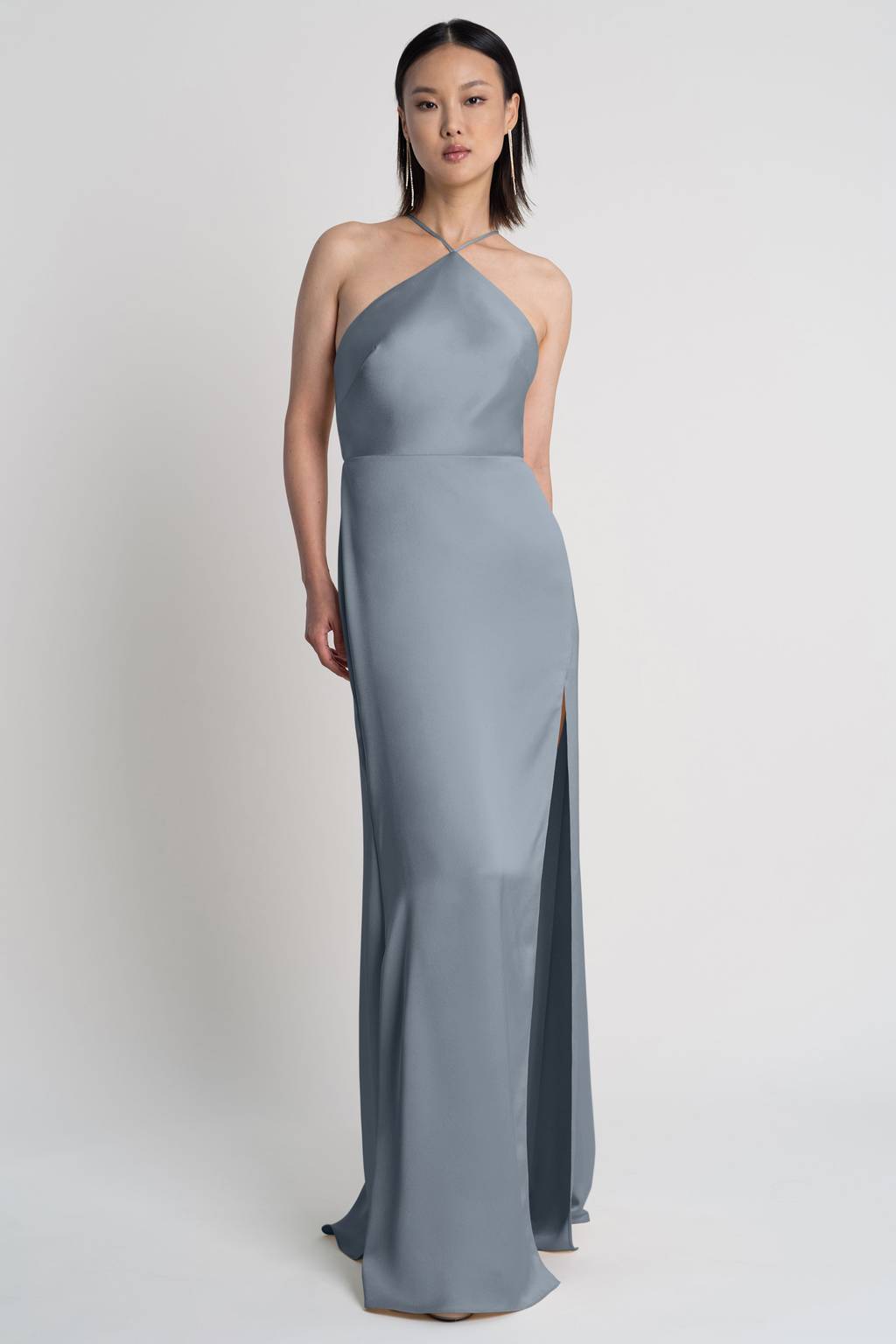 Our dusty blue bridesmaid dress color, Chambray. This medium muted tone is just the bridge you need to tie together other hues for a mix and match. Available in Luxe Satin and