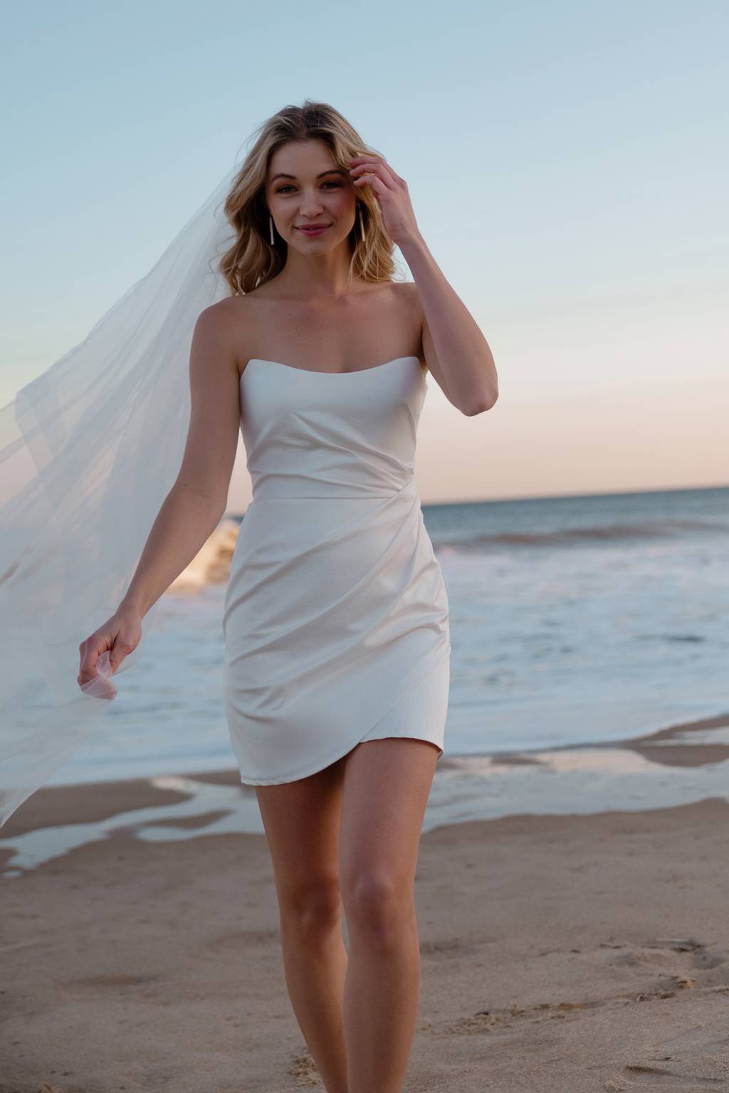 The Emily dress takes a playful yet chic approach to the idea of the little white dress. Featuring a beautifully sculptural ruffle placed atop a sleek, fitted mini dress, she’s sure to make an exciting entrance for any of your bridal events!